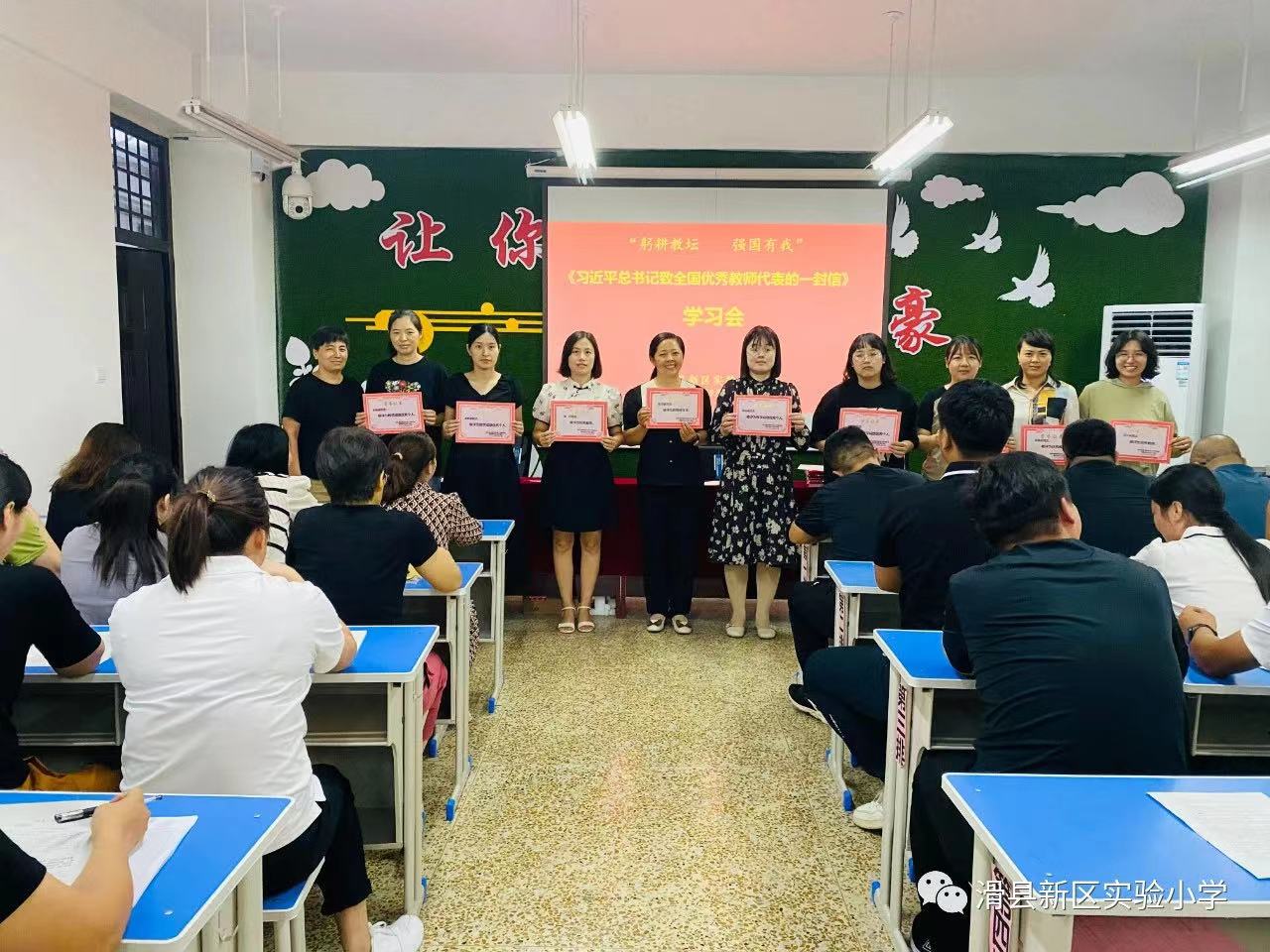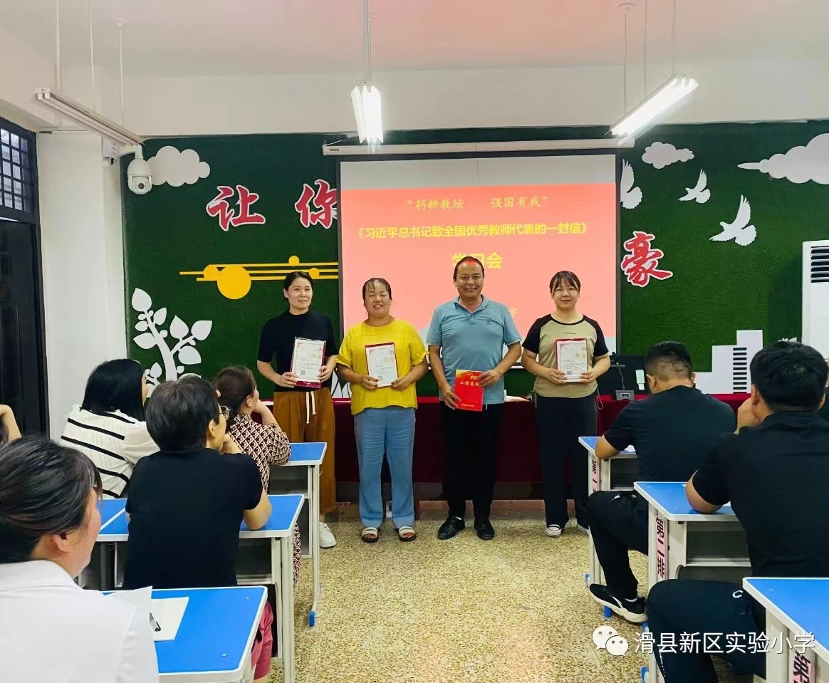 2023年9月11日,滑县新区实验小学召开《习近平总书记致全国优秀教师代表的一封信》学习会,大会由王媛君校长主持。在读完习近平总书记给全体教师代表的一封信后,广大教师深切感受到了党和国家对教师的关心和重视,感悟到总书记尊师重教的情怀。学习后老师们倍感温暖、倍感鼓舞,纷纷表示,一定不负总书记嘱托,要以教育家为榜样,大力弘扬教育家精神,牢记为党育人、为国育才的初心使命。